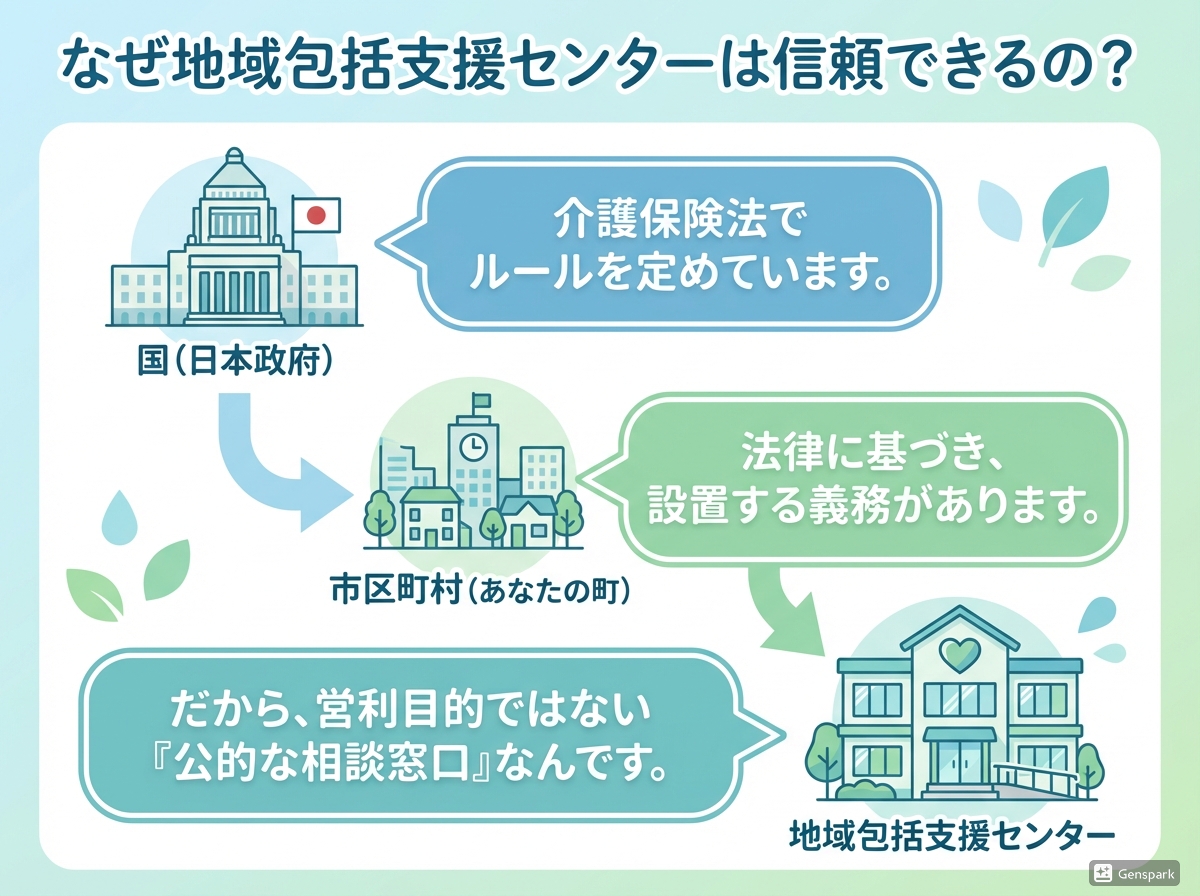 それは、地域包括支援センターが「介護保険法」という法律に基づいて、すべての市区町村に設置されている公的な相談窓口だからです。