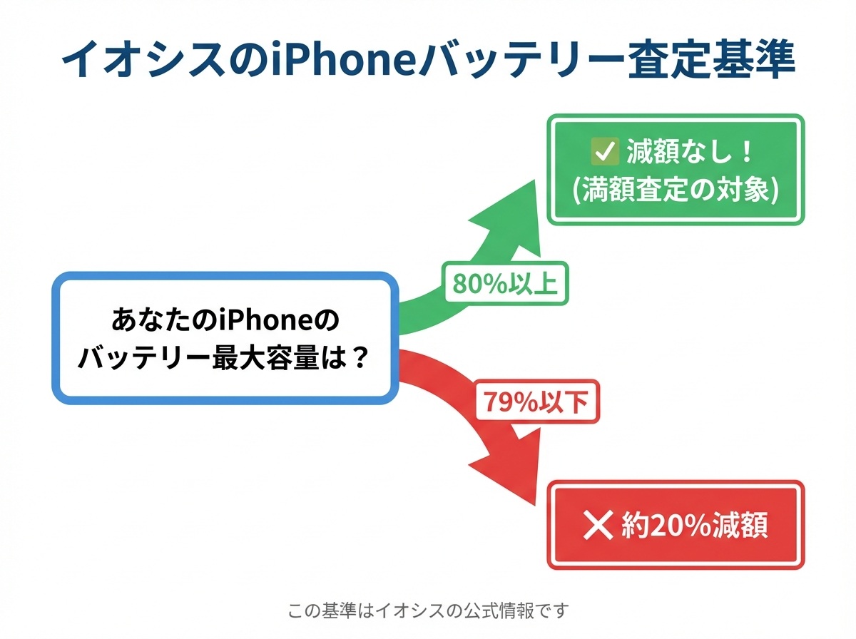 イオシス公式サイトの情報によれば、「バッテリー最大容量が80%未満だと約20%減額」という明確な公式ルールが存在します。