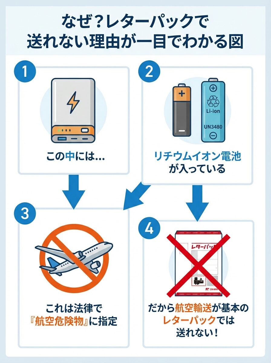 結論から言うと、モバイルバッテリーはリチウム電池を含むため、国内であればレターパックでの発送は可能ですが、離島などは航空便が利用できず陸送扱いとなり、配達が遅れる可能性があります。