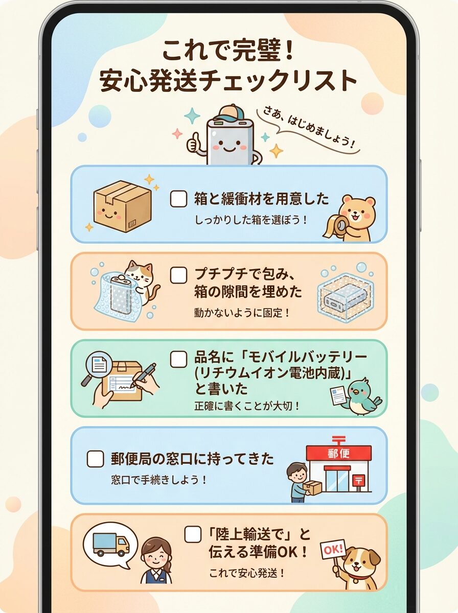 しかし、条件が複雑なため、モバイルバッテリーと同様にゆうパックで「陸上輸送」と指定するのが最も簡単で確実です。